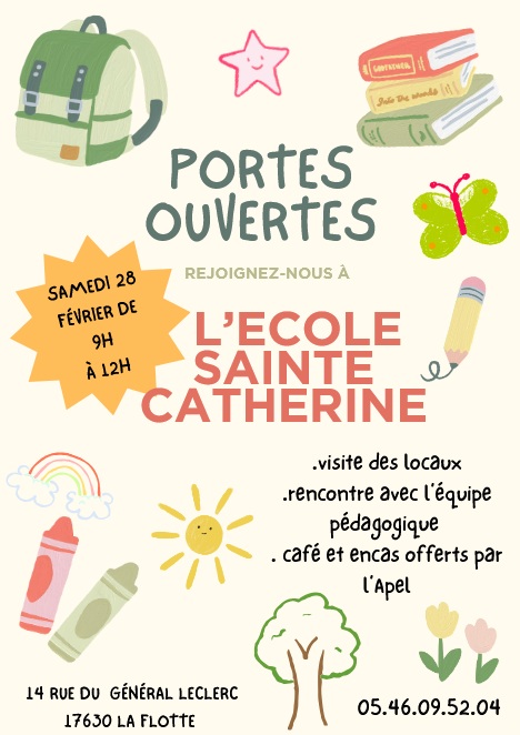 Toute l’équipe pédagogique est heureuse de vous accueillir le samedi 28 février 2026 pour les portes ouvertes de l’Ecole Sainte-Catherine au 14 rue du Général Leclerc à la Flotte.